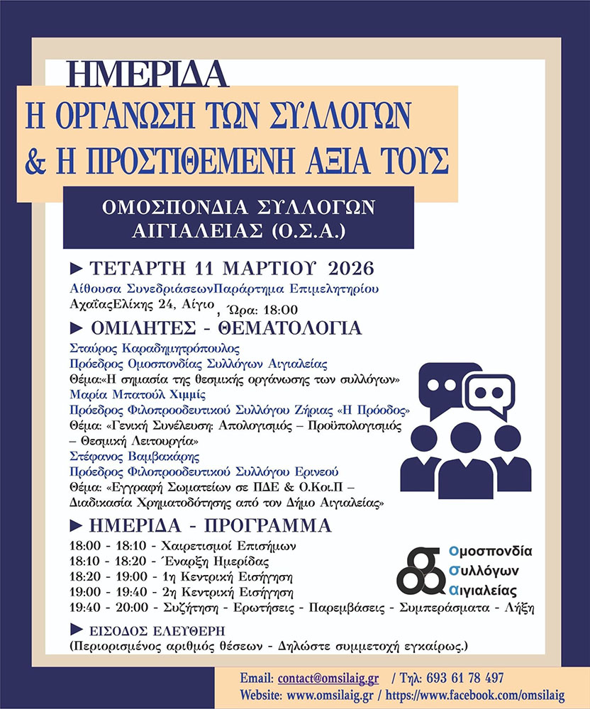 Η Ομοσπονδία Συλλόγων Αιγιαλείας, αναγνωρίζοντας τις σύγχρονες προκλήσεις, σας προσκαλεί στην 1η ημερίδα με θέμα: «Οργάνωση και Εκπαίδευση Διαχείρισης Πολιτιστικών Συλλόγων».
