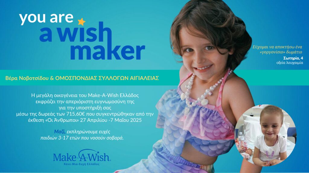 Μετά την ολοκλήρωση της εικαστικής έκθεσης πορτρέτων «Άνθρωποι», που διοργανώθηκε με μεγάλη επιτυχία από την Ομοσπονδία Συλλόγων Αιγιαλείας και την εικαστικό Βέρα Νοβοτσίδου, σε συνδιοργάνωση με τον Δήμο Αιγιαλείας και υπό την αιγίδα της Περιφέρειας Δυτικής Ελλάδας, ανακοινώνεται με συγκίνηση η κορύφωση αυτής της πρωτοβουλίας: η υλοποίηση της προσφοράς στον οργανισμό Make–A–Wish (Κάνε–Μια–Ευχή Ελλάδος). Χάρη